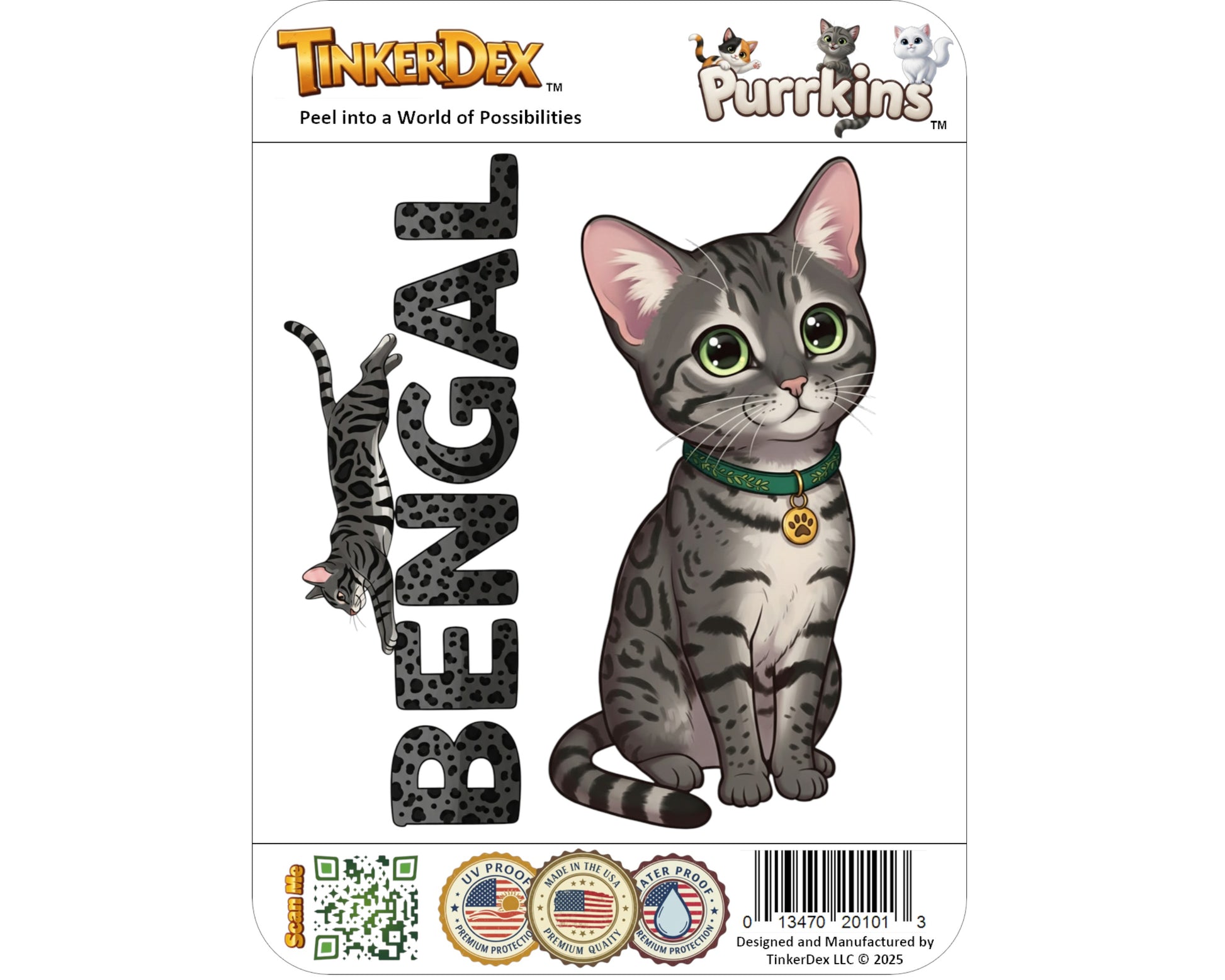 Unleash a touch of the wild with the stunning Bengal the Little Leopard design from the exclusive Purrkins™ collection by TinkerDex. Expertly crafted and beautifully stylized, this high-quality sticker captures the spirit of the Bengal—the intelligent and active cat, beloved as 'the Little Leopard' for its exotic, spotted coat and playful, dog-like personality.