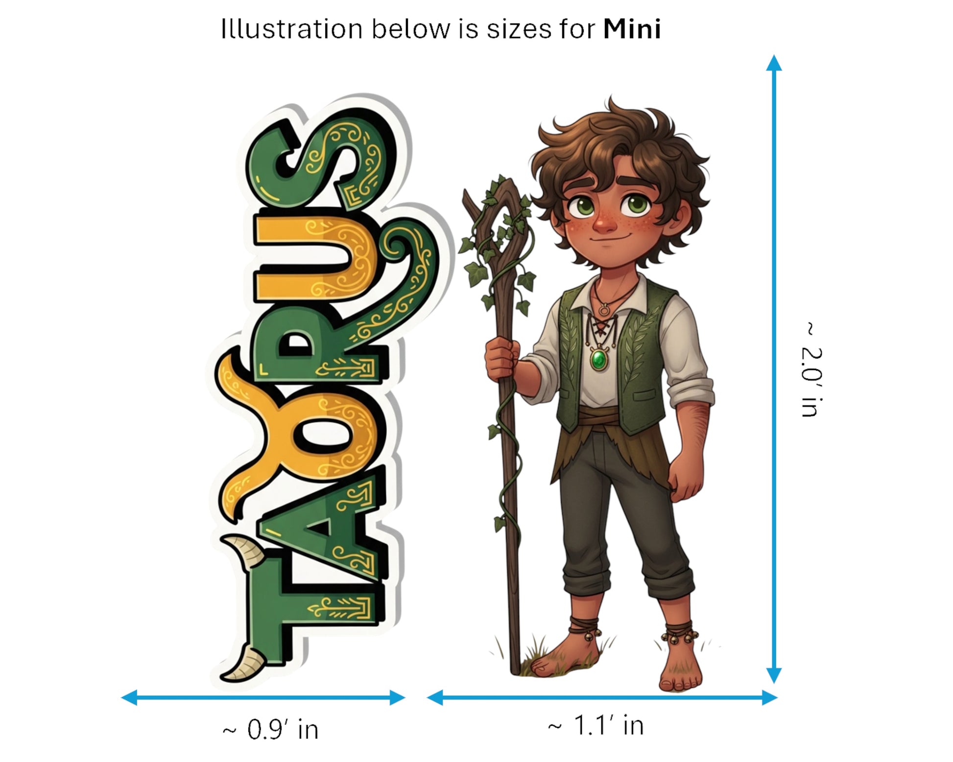Mini: Character is ~1.1" wide, Text is ~0.9" wide (Both ~2.0" tall)